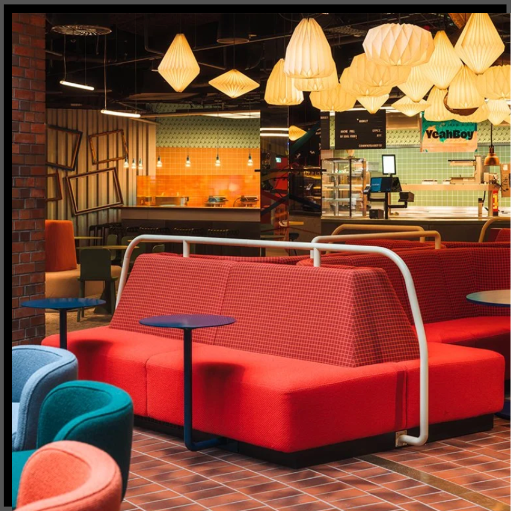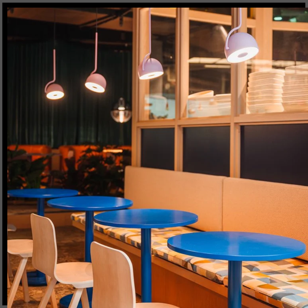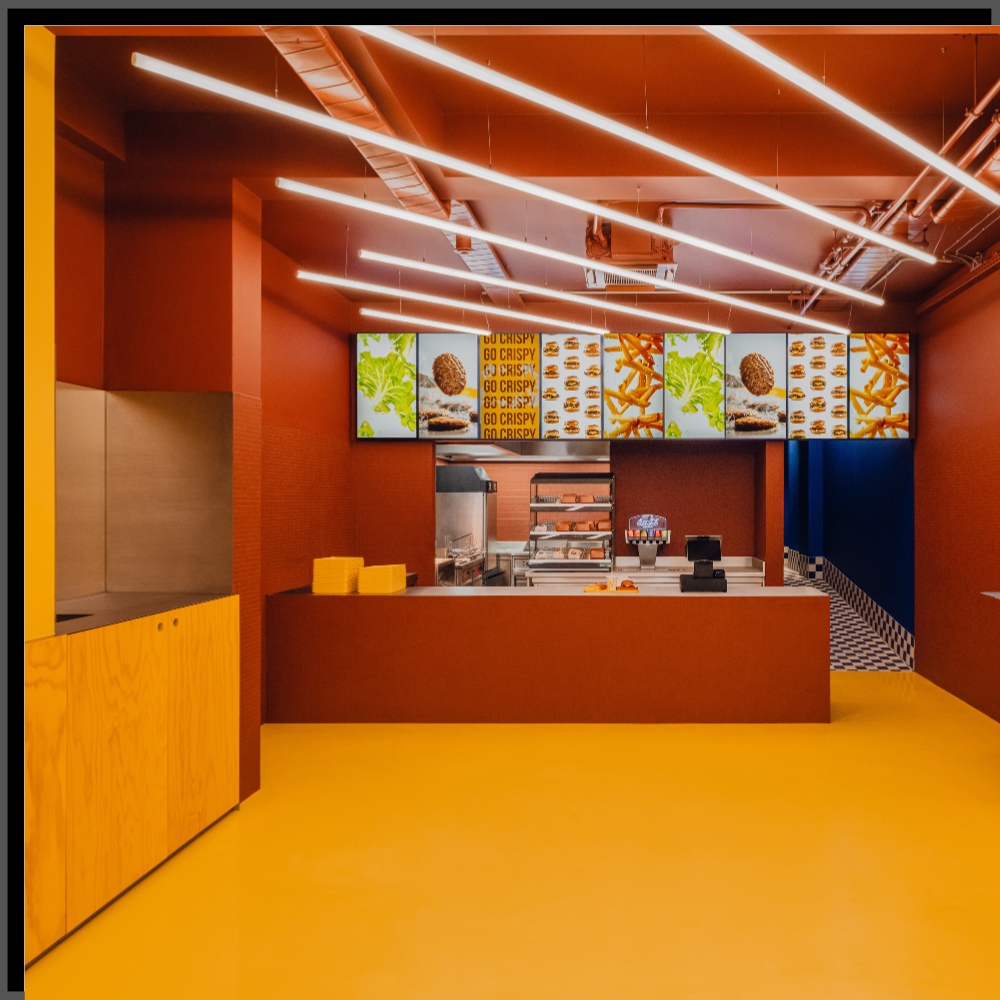 Ein Restaurant, das leuchtet, im wahrsten Sinne des Wortes. Beim Projekt Flip-N-Fry war das Ziel klar: ein Raum, der von außen sichtbar macht, wofür die Marke steht. Die Linienleuchten an der Decke bilden ein grafisches Raster, das durch die Fenster strahlt, als wäre das Licht selbst das Logo.