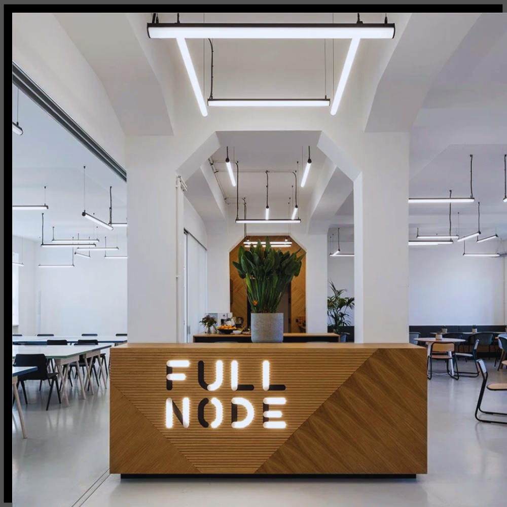 Full Node is both co-working and event space, housed in a listed post office building from 1927. The place was meant to reflect the innovative spirit of the blockchain scene—flexible, international, and future-oriented.